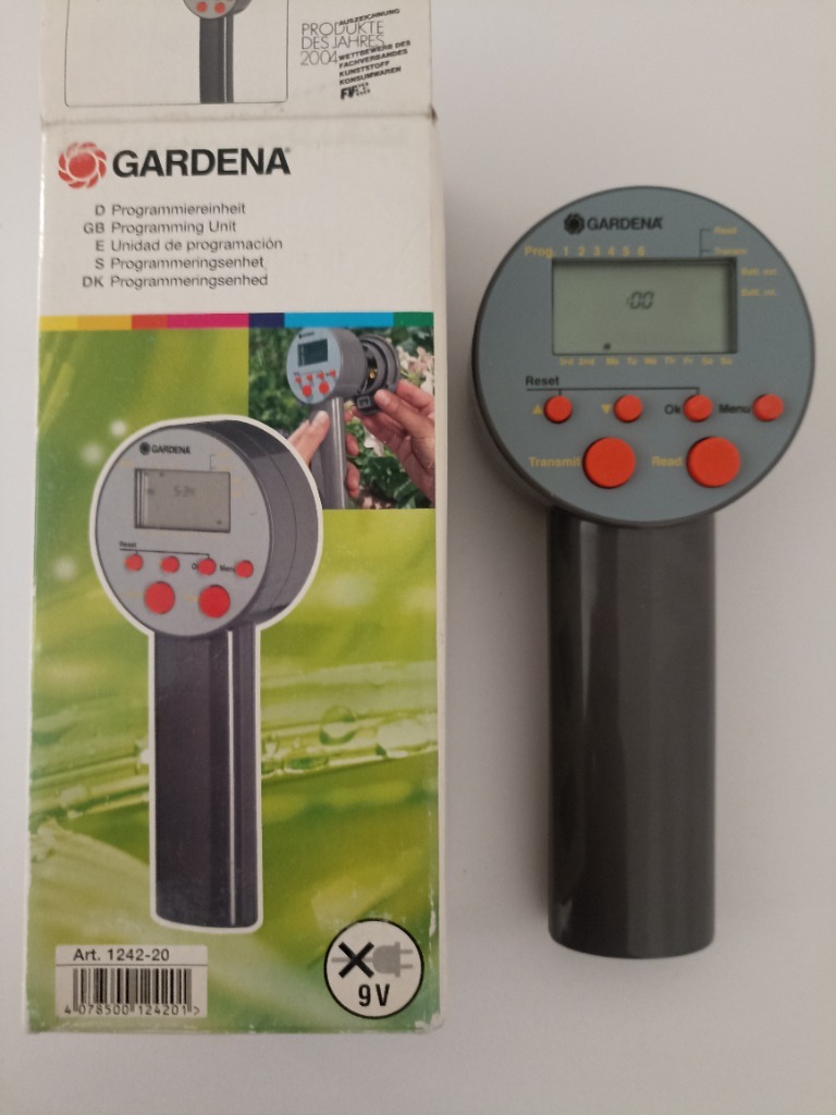 Programator marki Gardena służy do programowania elementów sterujących Gardena w systemie automatycznego sterowania instalacją nawadniającą, składającą się z wielu sekcji.Doskonale sprawdza się w sytuacji, gdy ilość wody nie wystarcza do równoczesnego działania całej instalacji. Również w przypadku zróżnicowanego zapotrzebowania na wodę poszczególnych obszarów ogrodu, obsadzonych różnymi roślinami, programator pozwala sterować ich nawadnianiem, zapewniając indywidualne i optymalne nawadnianie każdego fragmentu ogrodu.Programator jest szczególnie przydatny w przypadku braku dostępu do zasilania. Działa bez kabli, a dane są przesyłane przez naciśnięcie przycisku po podłączeniu zaworu.Zaprogramowany element sterujący montuje się na zaworze automatycznym 9 V, by sterował nim o określonych porach. Dla każdego dnia można wybrać do sześciu czynności nawadniania.Dni i cykle podlewania są programowane indywidualnie, a czas trwania można dowolnie ustawiać, w zakresie od jednej minuty do 9 godzin i 59 minut.Do działania urządzenia potrzebna jest jedna bateria alkaliczna 9 V, która zapewnia działanie urządzenia przez około rok.Do programatora można podłączyć dowolną liczbę zaworów automatycznych i elementów sterujących.