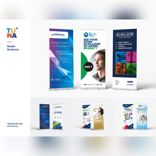 - rollupów, ścianek pop-up, stoisk targowych
