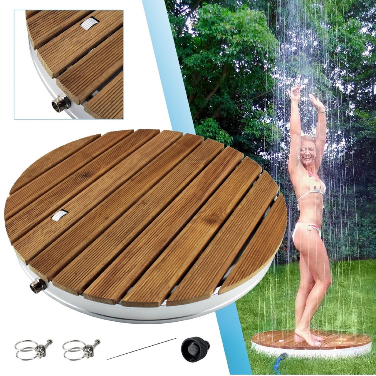 Innowacyjny prysznic ogrodowy z okrągłą płytą dolną z litego drewna tekowego. W gorące letnie dni zapewnia odświeżającą i kojącą ochłodę na zewnątrz oraz świetną zabawę dla dzieci, dorosłych i czworonogów. Solidny i odporny na działanie warunków atmosferycznych.