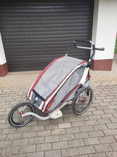 | Cechy dodatkowe | odblaski, torba, kółko spacerowe w zestawie, funkcja jogger, przestrzeń bagażowa, składana konstrukcja przyczepki, osłony przeciwsłoneczne, pasy mocujące, hamulec, amortyzacja, montowana do osi, kieszenie, moskitiera, pasy pięciopunktowe, pompowane koła, zaczep do roweru, folia przeciwdeszczowa |