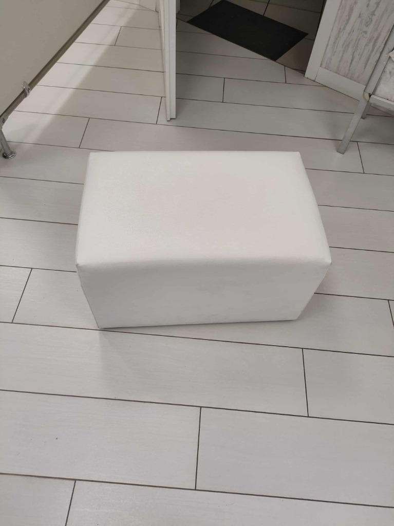 Biały, prosty puf o wymiarach 38x61x39 cm. Idealny jako dodatkowe siedzisko lub jako element dekoracyjny w salonie, sypialni, przedpokoju czy sklepie.