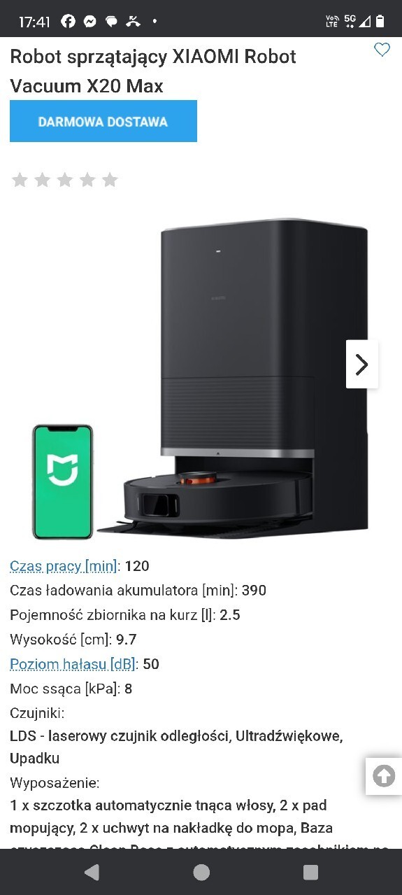 | Cechy dodatkowe | Robot Xiaomi Vacuum X20 Max stacja oczyszczająca 8000Pa siła ssania mopy 180 obr/min LDS 360° 75 dni bez opróżniania |