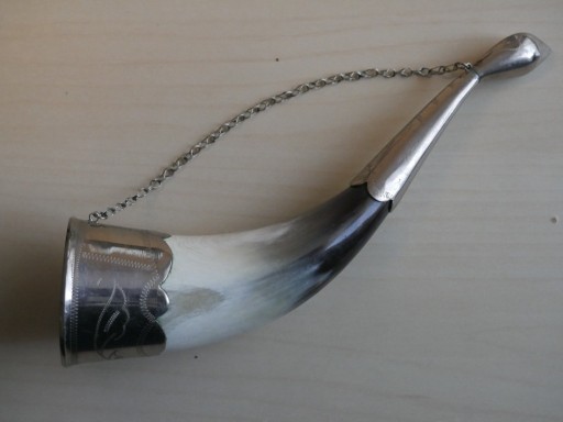 Róg do picia (tzw. róg obfitości lub róg myśliwski), wykonany z naturalnego rogu bydlęcego, ozdobionego metalowymi okuciami i łańcuszkiem.