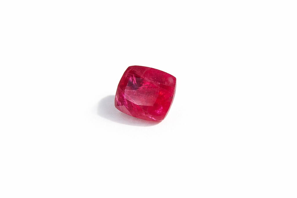 Kamień charakteryzuje się intensywną, purpurowo-czerwoną barwą oraz naturalnymi inkluzjami, typowymi dla nieulepszanych rubinów. Klasyczny szlif cushion nadaje mu elegancki i ponadczasowy wygląd.
