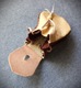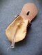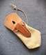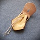 Szyta ręcznie, z naturalnych skór - brązowa z jelenia ok 1,5 mm grubości, trochę irchy, oraz garbowana roślinnie skóra bydlęca. Guziczek drewniany.