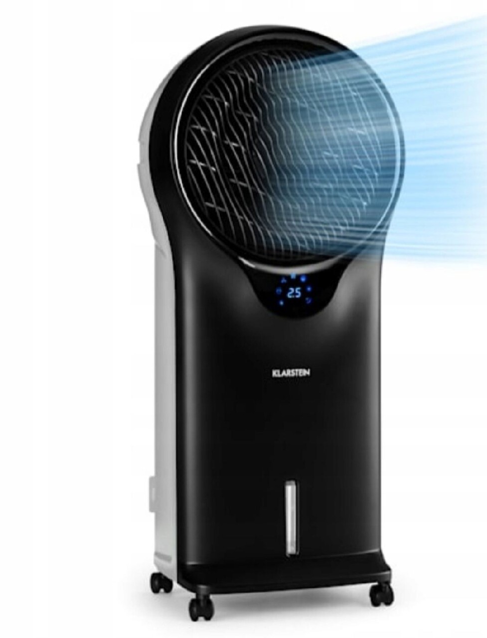 Schładzacz powietrza-wentylator-klimatyzator z trzema stopniami mocy, trzema trybami wentylacji i włączaną opcjonalnie funkcją obrotu lameli.