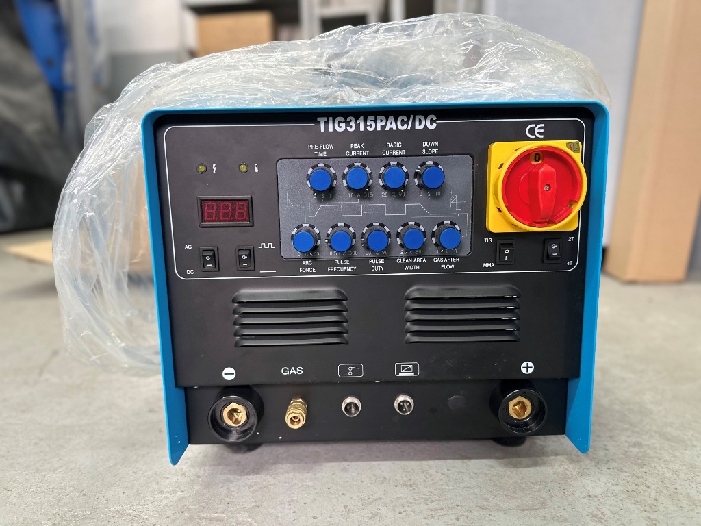 Spawarka TIG Sherman TIG 315P AC/DC - Profesjonalna spawarka inwertorowa TIG Sherman TIG 315P AC/DC. Przeznaczona do spawania metodą TIG prądem stałym i przemiennym (DC/AC), idealna do aluminium, stali nierdzewnej i metali kolorowych. Wyposażona w cyfrowy panel sterowania, pełną regulację parametrów (prąd początkowy, końcowy, puls, częstotliwość, balans AC, czas narastania/opadania prądu, przepływ gazu), wyświetlacz LED oraz duży przycisk awaryjny. Spawarka umożliwia spawanie w trybie 2T/4T, posiada funkcje HOT START, ARC FORCE, zajarzanie HF i pamięć ustawień. W zestawie przewody, instrukcja i komplet akcesoriów. Sprzęt nowy, nieużywany.