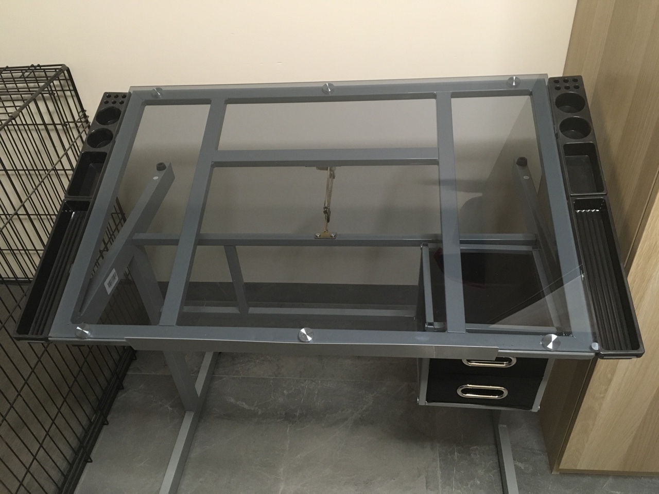 Szary stol kreslarski ze szklanym blatem 5mm, metalowá rama 60/105/75, nowy, nie uzywany bez opakowania