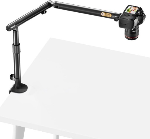 【Możliwość regulacji szerokości】Ten stojak na aparat jest regulowany pod wieloma kątami. Składa się z 3 ramion przegubowych. Pierwsze dwa ramiona przegubowe można obracać w poziomie o 180° lub 360°, co ułatwia nagrywanie większego pola widzenia. Dolny zacisk stołowy ma regulowany zakres zacisku do 7,5 cm, który można dopasować do stołów lub stołów roboczych o różnej grubości i zapewnia stabilne trzymanie.
