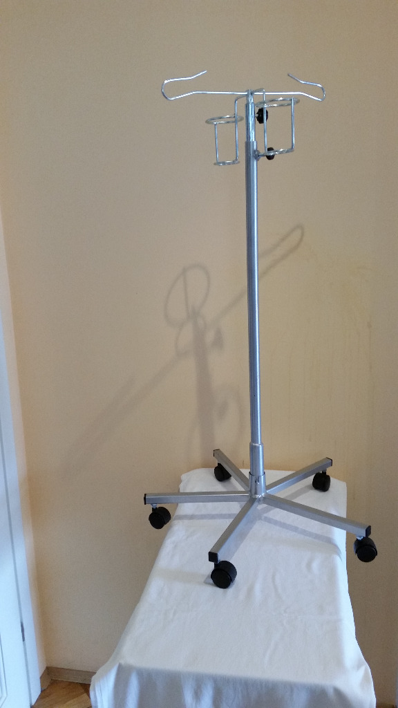 Stojak do kroplówek o solidnej konstrukcji, łatwy w przemieszczaniu się, na kółkach. Regulowana wysokość, składany do magazynowania. Możliwość używania 4 haków.