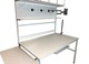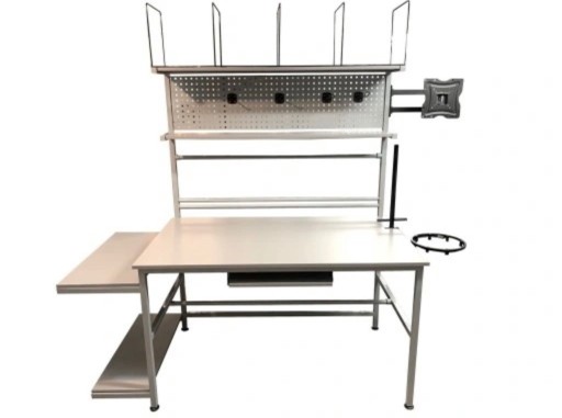Profesjonalny stół do pakowania paczek wykonany z solidnej stalowej konstrukcji malowanej proszkowo oraz blatów z płyty meblowej laminowanej. Stół wyposażony został w: