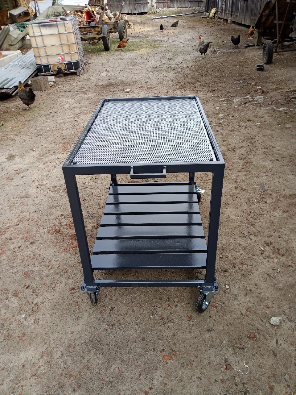 Stół warsztatowy mobilny o wymiarach 104x76 cm przeznaczony do napraw i demontażu podzespołów takich jak silniki skrzynie biegów czy siłowniki w których znajdują się płyny eksploatacyjne. Blat wykonany z profili oraz ułożonej na nich blasze perforowanej o otworach kwadratowych 3x3mm. Boki ociekacza wykonane z blachy o gr 2mm. Wysokość blatu ok 80cm. Ociekacz pozwala na rozbieranie różnych podzespołów bez obawy o to czy płyny w nich się znajdujące wyleją się na podłogę warsztatu, gdyż zlewają się do podstawionego pojemnika. Możliwość wykonania stołu o innych wymiarach według potrzeb a także wykonania metalowego zbiornika na płyny czy dołożenia szerszej półki dolnej. Wystawiam dowód zakupu paragon lub fakturę uproszczona. Możliwość wysyłki lub transportu po wcześniejszym uzgodnieniu.
