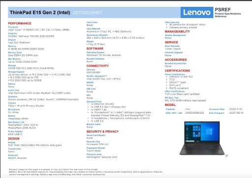 | Model | ThinkPad E15 Gen 2 (Intel) 20TD002MRT |
