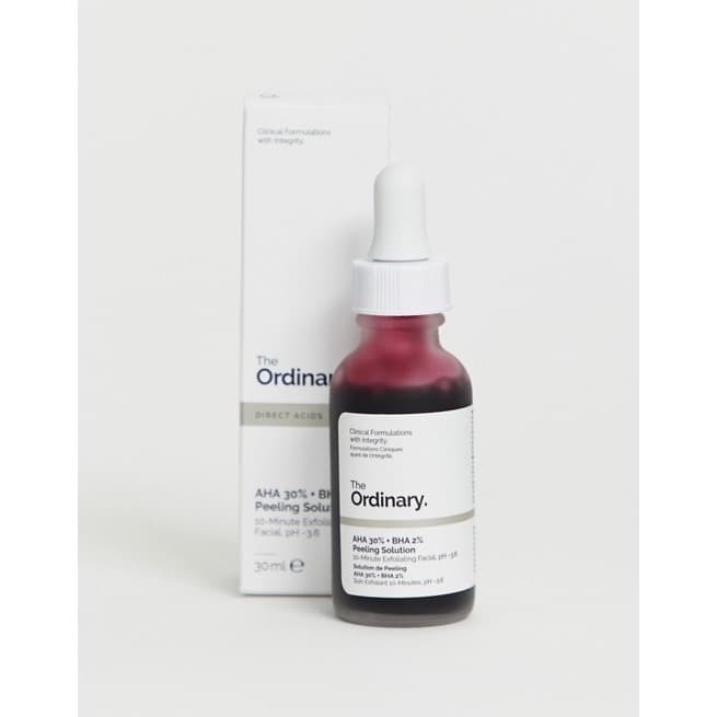 The Ordinary - AHA 30% + BHA 2% Peeling Solution- peeling kwasowy łączący-hydroksykwasy (kw. glikolowy, kw. mlekowy, kw. winowy, kw. cytrynowy) i-hydroksykwas(kw. salicylowy). Dzięki takiemu połączeniu możliwe jest zredukowanie wielu defektów skórnych takich jak przebarwienia, zmarszczkioraz zmniejszenie wydzielania łoju (które jest szczególnie nasilone przy skórze tłustej). Do produktu zostały dodane substancje mające na celu zmniejszenie podrażnienia związanego z użyciem peelingu kwasowego. Do tych substancji zaliczamysok z liści aloesuorazekstrakt zliści pieprzutasmańskiego (kolor rośliny zmienia się sezonowo, co może być to widoczne w formule preparatu). Peeling kwasowy zawiera takżekwas hialuronowyw postaci krzyżowego polimeru orazwitaminę B5wspomagającą procesy regeneracji naskórka. Uzupełnieniem produktu jest wyciąg z korzeni marchwi, który ma właściwości antyoksydacyjne. Kosmetyk ma pH wahające się między 3,5, a 3,7. Nie zawiera alkoholu, silikonów, olejów. Jest wegański, a podczas jego produkcji nie ucierpiały żadne zwierzęta.