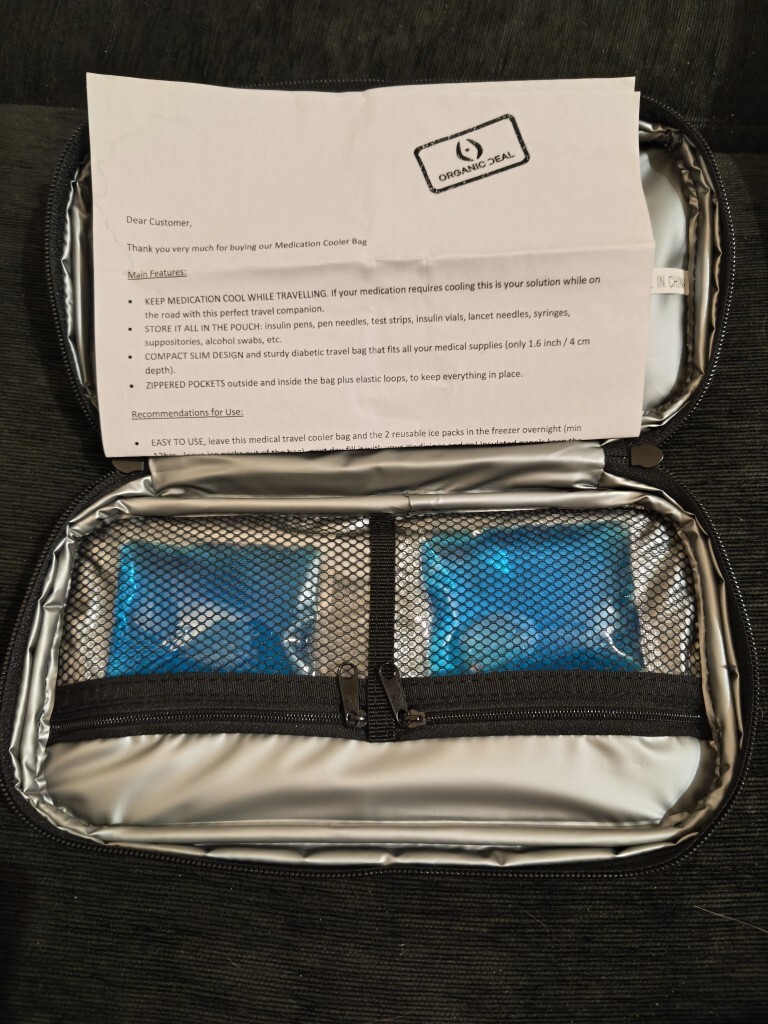 Torba termiczna na leki Organic Deal to kompaktowy, izolowany pokrowiec do przechowywania leków wymagających chłodzenia podczas podróży, takich jak insulina.
