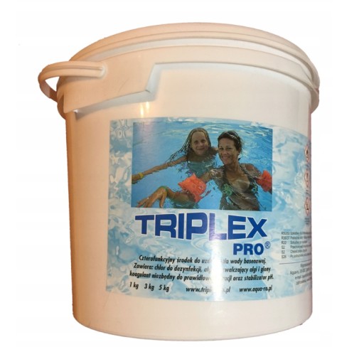 TRIPLEX PRO to wielofunkcyjny środek do uzdatniania wody w basenach kąpielowych. Jest całkowicie bezpieczny (posiada atest dopuszczający sprzedaż w UE), na rynku dostępny od 10 lat. Stosowanie środka Triplex Pro w odpowiednich dawkach połączone z filtracją zapewnia całkowitą opiekę nad wodą w basenie. Nie potrzeba stosować innych dodatkowych środków do uzdatniania wody, wystarczy raz w tygodniu wrzucić tabletkę/tabletki (ilość zależna od pojemności basenu) do skimera lub dozownika (pływającej bojki) aby cieszyć się krystalicznie czystą wodą. Przy prawidłowym dawkowaniu nie ma mowy aby woda stała się zielona. Wygoda stosowania oraz skuteczność to cechy, które czynią Triplex Pro najlepszym i niezastąpionym środkiem w uzdatnianiu wody basenowej. Triplex Pro w swoim składzie posiada 90% oczyszczony chlor do dezynfekcji skuteczny w zwalczaniu wirusów, bakterii i grzybów, aminę czwartorzędową odpowiadającą za blokowanie rozwoju glonów i drobnoustrojów oraz substancję do koagulacji na filtrach (flock).