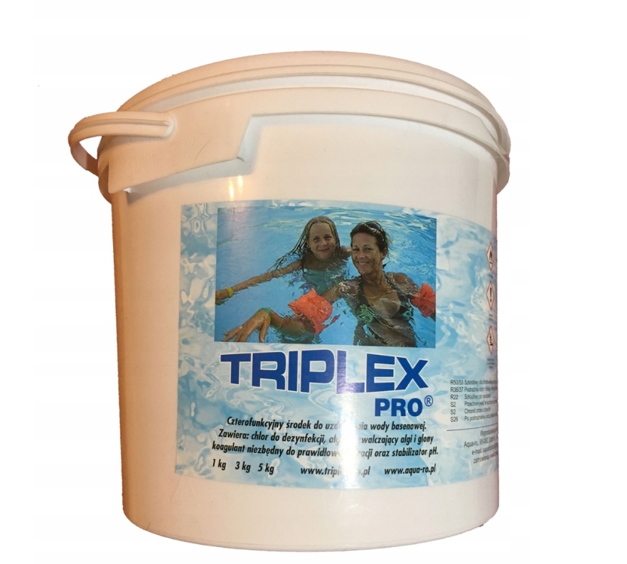 TRIPLEX PRO to wielofunkcyjny środek do uzdatniania wody w basenach kąpielowych. Jest całkowicie bezpieczny (posiada atest dopuszczający sprzedaż w UE), na rynku dostępny od 10 lat. Stosowanie środka Triplex Pro w odpowiednich dawkach połączone z filtracją zapewnia całkowitą opiekę nad wodą w basenie. Nie potrzeba stosować innych dodatkowych środków do uzdatniania wody, wystarczy raz w tygodniu wrzucić tabletkę/tabletki (ilość zależna od pojemności basenu) do skimera lub dozownika (pływającej bojki) aby cieszyć się krystalicznie czystą wodą. Przy prawidłowym dawkowaniu nie ma mowy aby woda stała się zielona. Wygoda stosowania oraz skuteczność to cechy, które czynią Triplex Pro najlepszym i niezastąpionym środkiem w uzdatnianiu wody basenowej. Triplex Pro w swoim składzie posiada 90% oczyszczony chlor do dezynfekcji skuteczny w zwalczaniu wirusów, bakterii i grzybów, aminę czwartorzędową odpowiadającą za blokowanie rozwoju glonów i drobnoustrojów oraz substancję do koagulacji na filtrach (flock).