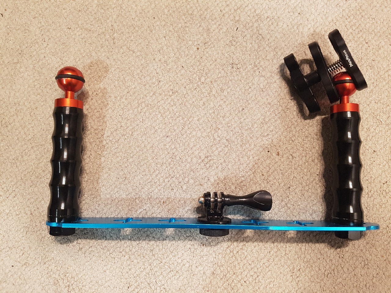 Przedmiotem jest uchwyt do kamer GO PRO i 2 źródeł światła. Wykonany z anodowanego aluminium . Dotkowo gratis zacisk kulowy.