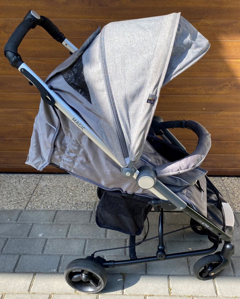 | Informacje dodatkowe | Amortyzatory, Blokada kół obrotowych, Hamulec, Odchylane oparcie, Pałąk bezpieczeństwa, Pełna rączka, Regulowany podnóżek, Skrętne koła |