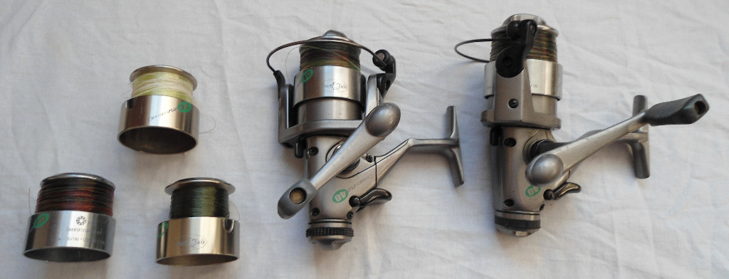 Dwie sztuki kołowrotków z wolną szpulą plus trzy szpule zapasowe. Wszystkie metalowe. Żyłki z 2020 roku, jeszcze sprawne. Kołowrotki karpiowe, używane, w stanie dobrym.