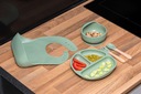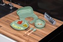 Zestaw naczyń został zaprojektowany z myślą o wsparciu procesu nauki samodzielnego jedzenia. Gładkie krawędzie zapewniają dziecku wyjątkową wygodę podczas nabierania i spożywania posiłków. Ergonomiczny widelec i łyżka, łatwe do uchwycenia, stanowią idealne narzędzia dla dzieci na różnym etapie rozwoju. Naczynia są szczególnie skoncentrowane na ułatwianiu wprowadzania stałych pokarmów od 6. miesiąca życia, sprzyjając rozwijaniu umiejętności samodzielnego spożywania zarówno miękkich, jak i stałych potraw.