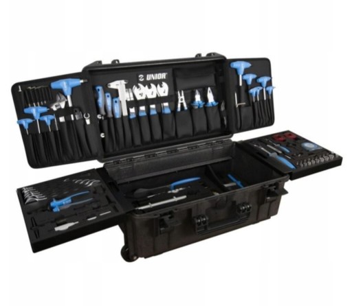 W pełni wyposażona walizka narzędziowa z 94 sztukami starannie dobranych, wysokiej jakości narzędzi Unior